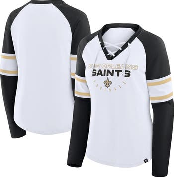 Dress in sporty retro fashion on New Orleans Saints game day with this Redzone Blitz Package Raglan Lace-Up V-Neck Long Sleeve T-Shirt by Fanatics. Its two-tone design features raglan sleeves for ease of movement and a stylish lace-up neckline. Crafted from lightweight jersey fabric, this New Orleans Saints tee offers a comfortable, breathable feel all day.