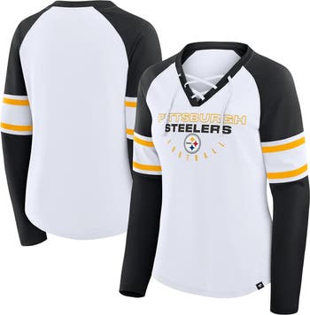 Dress in sporty retro fashion on Pittsburgh Steelers game day with this Redzone Blitz Package Raglan Lace-Up V-Neck Long Sleeve T-Shirt by Fanatics. Its two-tone design features raglan sleeves for ease of movement and a stylish lace-up neckline. Crafted from lightweight jersey fabric, this Pittsburgh Steelers tee offers a comfortable, breathable feel all day.