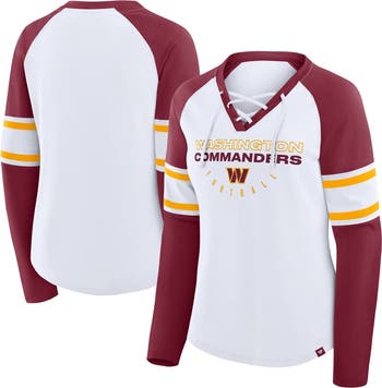 Dress in sporty retro fashion on Washington Commanders game day with this Redzone Blitz Package Raglan Lace-Up V-Neck Long Sleeve T-Shirt by Fanatics. Its two-tone design features raglan sleeves for ease of movement and a stylish lace-up neckline. Crafted from lightweight jersey fabric, this Washington Commanders tee offers a comfortable, breathable feel all day.