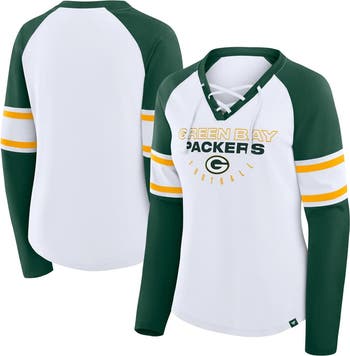 Dress in sporty retro fashion on Green Bay Packers game day with this Redzone Blitz Package Raglan Lace-Up V-Neck Long Sleeve T-Shirt by Fanatics. Its two-tone design features raglan sleeves for ease of movement and a stylish lace-up neckline. Crafted from lightweight jersey fabric, this Green Bay Packers tee offers a comfortable, breathable feel all day.