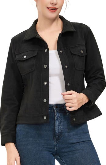 Classic with a modern twist, the Women's Faux Suede Trucker Jacket offers timeless style in a soft, elevated fabrication. Whether you're dressing up denim or softening an edgy look, this trucker jacket brings casual sophistication to your wardrobe.