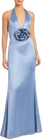 This satin halter slip dress blends elegance and allure, with a rosette detail and open cowl back. Embody timeless glamour at your next formal event.