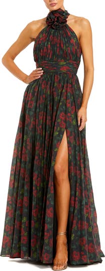 Elegant halter neck floral gown with rosette detail, ruched waist, and high slit. A perfect evening dress blending romance and sophistication.