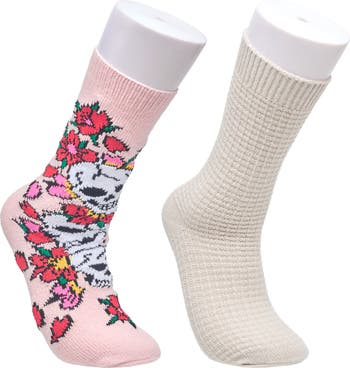 The Ed Hardy Women's Slouchy Sock 2-Pack combines bold edge with cozy style. One features signature tattoo-inspired skull and flower art in pink, while the other comes in a soft ivory waffle knit. Perfect for laid-back days with standout style.