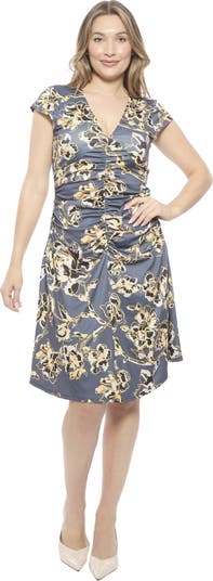 Elevate your look with this grey floral print flowing knee length dress from 24seven Comfort Apparel, designed with a graceful V neckline, cap sleeves, and soft ruching down the front that flatters every shape. The stretch fabric is machine washable and tumble dry. Pair with wedges or a sleek belt to create an effortlessly refined finish.