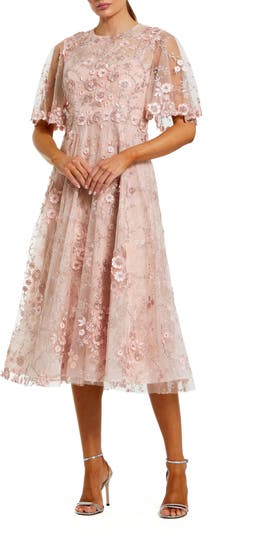 Elegant floral embroidered midi dress with sheer mesh flutter sleeves and an A-line silhouette—perfect for cocktail parties, weddings, dinners, and special events.