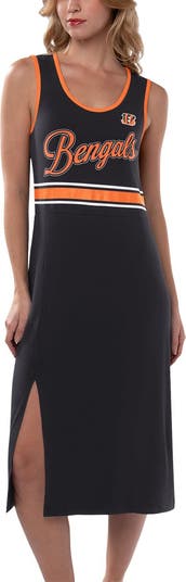 Change up your usual outfit on Cincinnati Bengals game day with this Main Field maxi dress. Its stylish design from G-III 4Her by Carl Banks features a contrast-color trim and stripes that accentuate the Cincinnati Bengals graphics printed across the front. A tie closure at the back of the neck lets you adjust the fit for the most comfortable wearing.