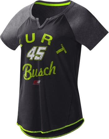 The Women's G-III 4Her by Carl Banks Black Kurt Busch Grand Slam Tri-Blend Notch V-Neck T-Shirt is the perfect way to show your support for Kurt Busch and the NASCAR community. Made from a comfortable blend of polyester, cotton, and rayon, this t-shirt features a flattering V-neck and a bold graphic of Kurt Busch's Grand Slam victory. Whether you're cheering him on at the track or just showing your support for one of NASCAR's most iconic drivers, this t-shirt is a must-have for any fan.