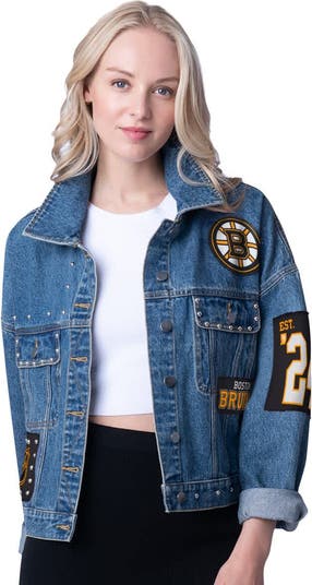 Cheer on the Boston Bruins with this G-III 4Her by Carl Banks Game Ball Cropped Button-Up Denim Jacket. This stylish denim jacket features a cropped hem and trendy dropped shoulders for a casual, flattering look. Embroidered applique Boston Bruins logos and stud embellishments throughout create a bold statement, showing off your fandom with a touch of edgy flair.