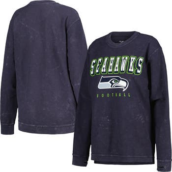 The Women's G-III 4Her by Carl Banks College Navy Seattle Seahawks Comfy Cord Pullover Sweatshirt is the perfect way to show your unwavering support for the Seattle Seahawks. Made from soft, washed corduroy fabric, this lightweight sweatshirt features screen-print graphics that proudly display your team pride. The fleece lining provides warmth on chilly game days, while the thumbholes in the cuffs keep your hands cozy. The droptail hem with side splits adds a touch of style, making this sweatshirt a must-have for any true Seattle Seahawks fan.