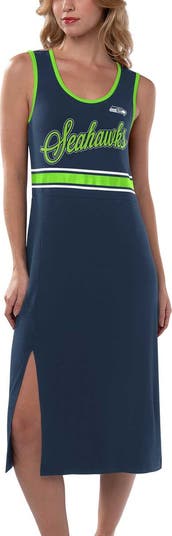 Change up your usual outfit on Seattle Seahawks game day with this Main Field maxi dress. Its stylish design from G-III 4Her by Carl Banks features contrast-color trim and stripes that accentuate the Seattle Seahawks graphics printed across the front. A tie closure at the back of the neck lets you adjust the fit for the most comfortable wearing.