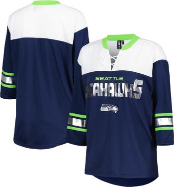 The Women's G-III 4Her by Carl Banks College Navy/White Seattle Seahawks Double Team 3/4-Sleeve Lace-Up T-Shirt is the perfect way to show your support for the Seattle Seahawks. With its dropped shoulders, lace-up neckline, and rounded droptail hem, this shirt is both stylish and comfortable. The screen print graphics with foil details add a touch of flair, and the polyester material is sure to keep you cool and dry on game day. Whether you're cheering from the stands or watching from home, this shirt is a must-have for any Seattle Seahawks fan.