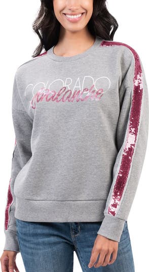 The Women's G-III 4Her by Carl Banks Gray Colorado Avalanche Penalty Box Pullover Sweatshirt is a must-have for any true Colorado Avalanche fan. This lightweight sweatshirt, perfect for mild temperatures, features rib-knit cuffs and dropped shoulders for a comfortable fit. The screen print and sequin graphics proudly display your Avalanche pride, while the crossover keyhole back adds a stylish touch. Whether you're cheering from the stands or showing support, this sweatshirt is the perfect way to represent your favorite team.