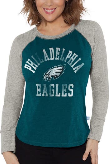 The Women's G-III 4Her by Carl Banks Midnight Green/Heather Gray Philadelphia Eagles Waffle Knit Raglan Long Sleeve T-Shirt is the perfect way to show unwavering support for the Philadelphia Eagles. With distressed screen print graphics and waffle-knit fabric, this shirt is stylish and comfortable. Raglan sleeves and flatlock stitching add athleticism, while the rounded droptail hem provides a flattering fit. Whether cheering at the stadium or relaxing at home, this shirt is sure to become a favorite.