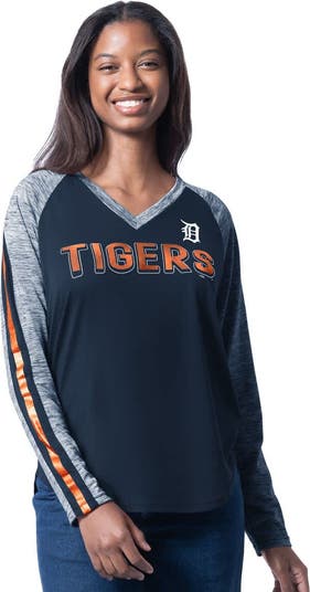 Show off your unwavering team spirit with this Detroit Tigers Top Dog Raglan Long Sleeve V-Neck T-Shirt from G-III 4Her by Carl Banks. The rounded droptail hem provides additional coverage and a flattering silhouette, while the raglan sleeves offer greater freedom of movement in the shoulders and arms. The glitter details add a touch of sparkle, making this tee a standout piece in any Detroit Tigers fan's wardrobe.