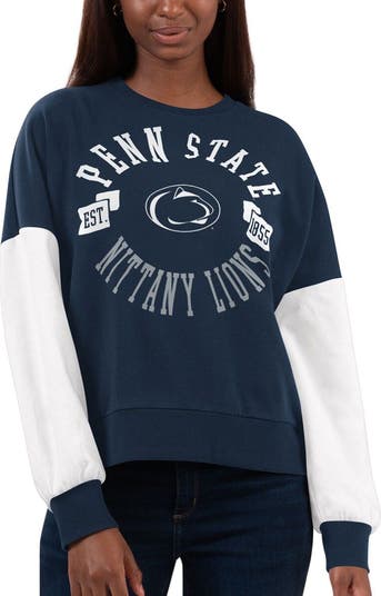The Women's G-III 4Her by Carl Banks Navy/White Penn State Nittany Lions Team Pride Colorblock Pullover Sweatshirt is the perfect way to show your support for the Penn State Nittany Lions. This lightweight sweatshirt is made of a soft cotton and polyester blend, making it comfortable to wear all day long. The fleece lining will keep you warm on chilly game days, and the contrast-color sleeves add a touch of style. With screen-print graphics of the Penn State Nittany Lions logo, this sweatshirt is sure to make you stand out from the crowd.