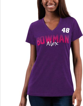 The Women's G-III 4Her by Carl Banks Purple Alex Bowman Snap V-Neck T-Shirt is a must-have for any Alex Bowman fan. With its vibrant purple color and screen-print graphics, this T-shirt proudly displays your support for the NASCAR star. The ribbed V-neck collar adds a touch of style, while the cotton and polyester blend ensures comfort and durability. Whether you're cheering Alex Bowman on at the track or just showing your support, this T-shirt is the perfect way to represent your favorite driver.