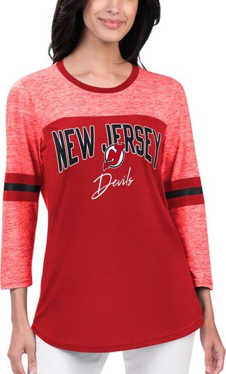 The Women's G-III 4Her by Carl Banks Red New Jersey Devils Play The Game 3/4-Sleeve T-Shirt is the perfect way to show your support for the New Jersey Devils. Made from a comfortable polyester and viscose blend, this shirt features screen print graphics that proudly display your team pride. The rounded hem and crew neck provide a comfortable fit, while the three-quarter sleeve design is perfect for any season. Whether you're cheering on the Devils at the Prudential Center or just showing your support around town, this shirt is sure to turn heads.