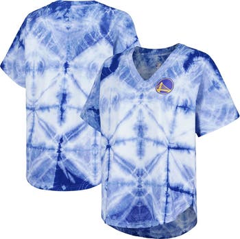 The Women's G-III 4Her by Carl Banks Royal Golden State Warriors Tournament Raglan Oversized Tie-Dye V-Neck T-Shirt is the perfect way to show your support for the Golden State Warriors. This oversized tie-dye T-shirt features raglan sleeves and a rounded droptail hem for a comfortable and stylish fit. The screen print graphics proudly display the Golden State Warriors logo, making it a must-have for any fan. Whether you're cheering on the Warriors at the game or just relaxing at home, this T-shirt is sure to become a favorite.