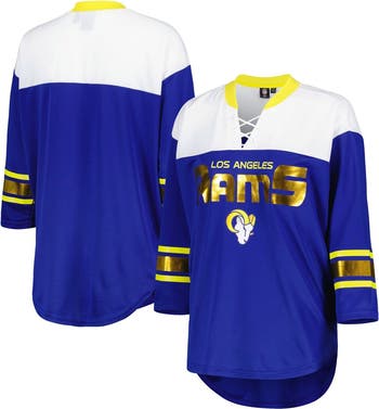 The Women's G-III 4Her by Carl Banks Royal/White Los Angeles Rams Double Team 3/4-Sleeve Lace-Up T-Shirt is the perfect way to show your support for the Los Angeles Rams. With its dropped shoulders, lace-up neckline, and rounded droptail hem, this shirt is both stylish and comfortable. The screen print graphics with foil details add a touch of flair, and the polyester material is sure to keep you cool and dry on game day. Whether you're cheering from the stands or watching from home, this shirt is a must-have for any Los Angeles Rams fan.