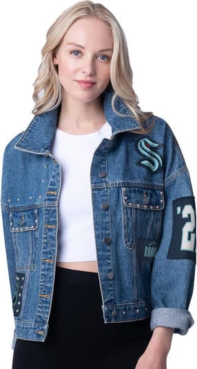 Cheer on the Seattle Kraken with this G-III 4Her by Carl Banks Game Ball Cropped Button-Up Denim Jacket. This stylish denim jacket features a cropped hem and trendy dropped shoulders for a casual, flattering look. Embroidered applique Seattle Kraken logos and stud embellishments throughout create a bold statement, showing off your fandom with a touch of edgy flair.