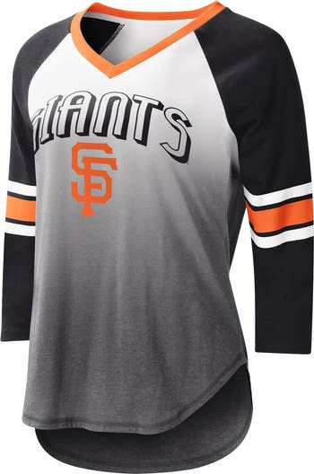 The Women's G-III 4Her by Carl Banks White/Black San Francisco Giants Lead-Off Raglan 3/4-Sleeve V-Neck T-Shirt is the perfect way to show your support for the San Francisco Giants. With its raglan sleeves, flatlock stitching, and rounded droptail hem, this shirt is both stylish and comfortable. The ombre design adds a touch of flair, while the San Francisco Giants logo proudly displays your team spirit. Whether you're cheering on the Giants at the ballpark or just relaxing at home, this shirt is sure to become a favorite.