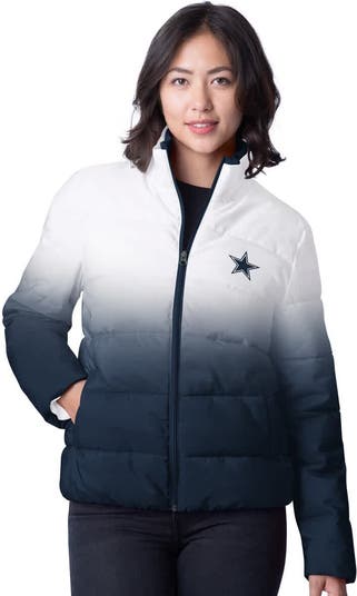 Stay warm while you cheer on your Dallas Cowboys with this G-III 4Her by Carl Banks Overtime Ombre Full-Zip Puffer Jacket. This stylish puffer jacket features a quilted, ombre design that is sure to turn heads. With screen-printed team graphics on the left chest, everyone will know who you're rooting for on game day. The midweight construction and rib-knit lining inside the neck provide the perfect amount of warmth for moderate temperatures, while the droptail hem adds a touch of feminine flair.