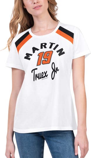 The Women's G-III 4Her by Carl Banks White Martin Truex Jr Score T-shirt is a must-have for any Martin Truex Jr fan. With its screen print graphics, this shirt proudly displays your support for the NASCAR star. Made from a comfortable cotton and polyester blend, this shirt is perfect for any occasion, whether you're cheering on Martin Truex Jr at the track or just showing your support for your favorite driver.