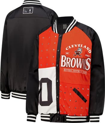 Show off your Cleveland Browns spirit in style with this Gameday Couture Oversized Hot Shot Rhinestone Throwback Full-Snap Varsity Bomber Jacket. This eye-catching bomber jacket features a stylish blend of throwback design and modern details, including sparkling rhinestones and a mesh overlay. The oversized fit provides a comfortable, relaxed feel, perfect for game day or any day you want to show your Cleveland Browns spirit.