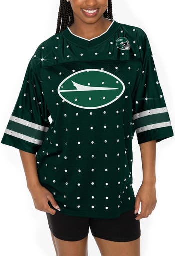 Sparkle and shine on New York Jets game day in this Kickoff Time Allover Rhinestone Sports Stripe Jersey V-Neck T-Shirt by Gameday Couture. The dazzling rhinestone design with stripes and printed team details make it a show-stopping choice for fashionable fans. Breathable mesh fabric ensures you stay cool and comfortable while sporting this chic New York Jets top.