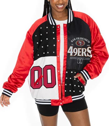 Show off your San Francisco 49ers spirit in style with this Gameday Couture Oversized Hot Shot Rhinestone Throwback Full-Snap Varsity Bomber Jacket. This eye-catching bomber jacket features a stylish blend of throwback design and modern details, including sparkling rhinestones and a mesh overlay. The oversized fit provides a comfortable, relaxed feel, perfect for game day or any day you want to show your San Francisco 49ers spirit.