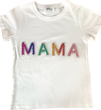 Classic white T-shirt featuring a bold "MAMA" design with colorful gem embellishments. Vibrant, hand-placed rhinestones add a touch of sparkle and elegance. Soft, breathable cotton fabric for all-day comfort. Slim fit with a classic crew neckline for effortless style. Perfect for moms who love to shine—ideal for casual days, outings, or gifting.