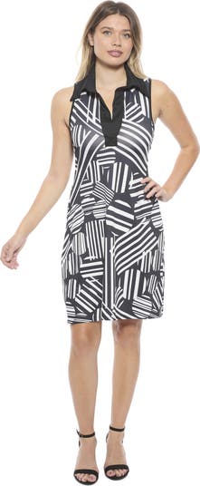 Stand out in style with this 24seven Comfort Apparel sleeveless A line dress, featuring a crisp collared neckline and relaxed fit for effortless elegance. The black geometric print adds a classy vibe, while the knee length hem keeps it modern and playful. Crafted from a soft polyester blend, it ensures all day comfort and is machine washable for easy care.