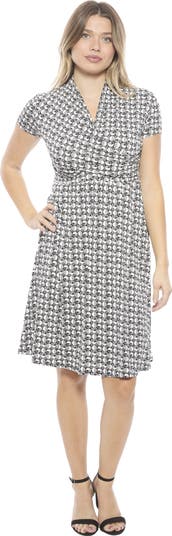 Womens Geometric V-Neck Short Sleeve Faux Wrap Knee Length A-Line Dress