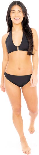 Women's Goldie Two Piece Halter Top Swimsuit With Open Face Gold Rectangle Bar Center Chest Collar And Side Hips
