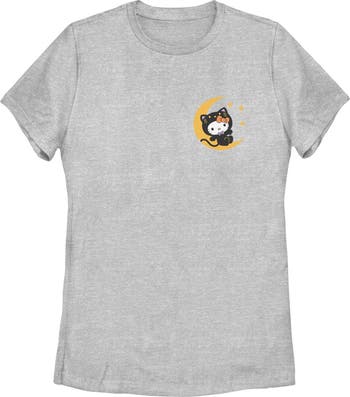- Show off your impeccable taste with this stylish new women's t-shirt that is perfect for every occasion! Featuring Hello Kitty wearing a black cat costume, lying on a crescent moon printed on the left pocket.
