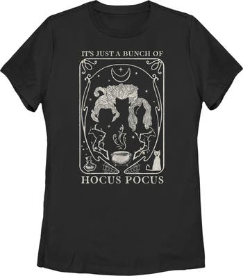 If you're looking for a little hocus pocus this Halloween, then look no further than this officially licensed Disney Hocus Pocus Witch Tarot Card Women's Graphic T-Shirt. You can light the Black Flame candle to awaken the Sanderson witches this Halloween, or you could just celebrate the holiday with this festive Hocus Pocus style instead! A sleek cartoon shows off Binx the cat and the Sanderson sisters like Mary, Winifred, and Sarah in a fun tarot card style that reads "It's Just a Bunch of Hocus Pocus" across this women's tee.