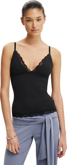 This V-neck cami slips on with thin straps and a smooth, barely-there feel. With delicate lace trims detail on bust and hem