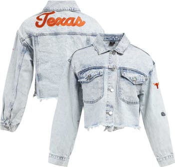 Make a fashion statement on Texas Longhorns game day in this Lightwash Cropped Button-Up Jean Jacket from Hype and Vice. Featuring classic denim fabric with a washed design, its trendy and timeless look provides a versatile addition to your wardrobe. The embroidered team logo on the left sleeve and patches displayed across the back showcase your Texas Longhorns fandom in style.