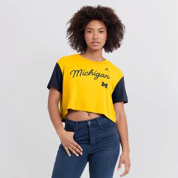 Put together a stylish Michigan Wolverines outfit with this Color-Block Script Dri-FIT Cropped T-Shirt by Jordan Brand. It features dropped shoulder seams for a relaxed, casual look that provides ease of movement. Sweat-wicking technology keeps you cool and dry in this Michigan Wolverines top, whether you're at the game or on the go.