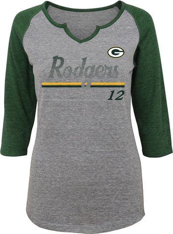 Women's Juniors Aaron Rodgers Heathered Gray/Green Green Bay Packers Over the Line Player Name & Number Tri-Blend 3/4-Sleeve V-Notch T-Shirt