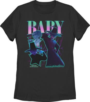 - Unleash your inner idol with this eye-catching women's graphic t-shirt perfect for concerts, hangouts, or everyday slaying! Featuring a colorful collage of Baby from K-pop Demon Hunters printed across the front.