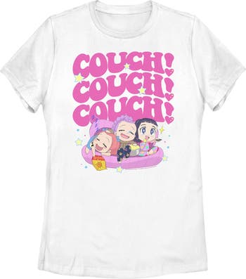 Prepare for debut with these incredible designs from the new, top-charting Netflix Film: K-Pop Demon Hunters! Dance to Soda Pop or Takedown with this Women's Cute Friendship Couch Time Graphic T-shirt featuring Mira, Rumi, and Zoey sitting on a couch having a movie night and eating snacks, and the text "Couch! Couch! Couch!" in bold pink lettering in the background. These designs are going to be everything you can think of, so gear up to take all demons down while looking like the greatest idol the world has ever seen with out-of-this-world, officially licensed K-Pop Demon Hunters apparel!