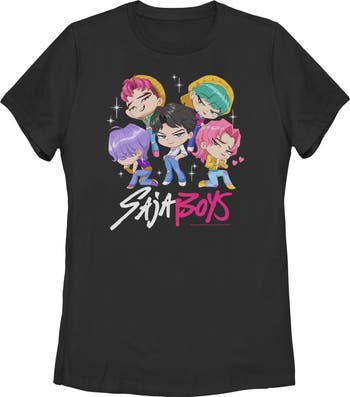 - Unleash your inner idol with this eye-catching women's t-shirt perfect for concerts, hangouts, or everyday slaying! Featuring the Saja Boys in chibi style and their band logo printed across the front