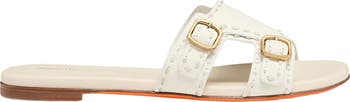 The Didi flat sandal reinterprets Santoni's heritage codes through a modern lens, embracing the foot with a wide band inspired by our iconic double buckle. This tumbled leather version features hand-stitching along the edges: a sophisticated tribute to Le Marche and its traditional art of basket weaving.