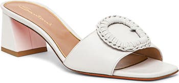 Elegant lines and Santoni heritage define the statement allure of this fine leather sandal. Its sophisticated yet versatile silhouette is styled with a block heel and wide strap. Crowned with an intricately handwoven interpretation of Santoni's hallmark buckle: an emblem of the Maison's defining values, culture and aesthetic sensitivity.