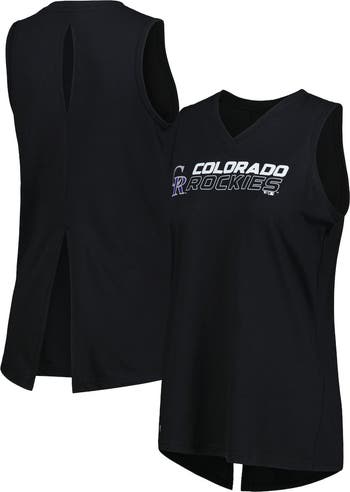 The Women's Levelwear Black Colorado Rockies Paisley Chase V-Neck Tank Top is the perfect way to show your support for the Colorado Rockies. Made from a comfortable polyester and cotton blend, this tank top features heat-sealed graphics that showcase your Rockies pride. The slit at the back of the neck and droptail hem add a touch of style, while the official Colorado Rockies logo proudly displays your allegiance. Whether you're cheering at the game or just showing your support, this tank top is a must-have for any Rockies fan.