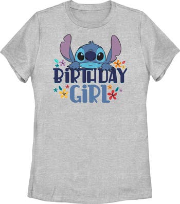 - Own the moment with this stylish new women's t-shirt that is perfect for that special day! Featuring Stitch peeking over the phrase: "Birthday Girl" in shades of blue, surrounded by colorful flowers across the front.