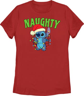 - Strut your stuff with this stylish new Christmas women's tee that is perfect for the holidays! Featuring the adorable Stitch entangled by Christmas lights and the text "Naughty" across the front.