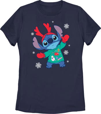 Ohana means family, and family means no tee gets left behind! Find the perfect style with this officially licensed Women's Disney Lilo & Stitch Christmas Outfit Stitch Graphic T-Shirt! This adorable design features Stitch all ready for Christmas wearing a reindeer antlers, mittens, and a Christmas sweater. Celebrate a certain alien, otherwise known as Experiment 626 this holiday season with a new festive apparel from the movie!